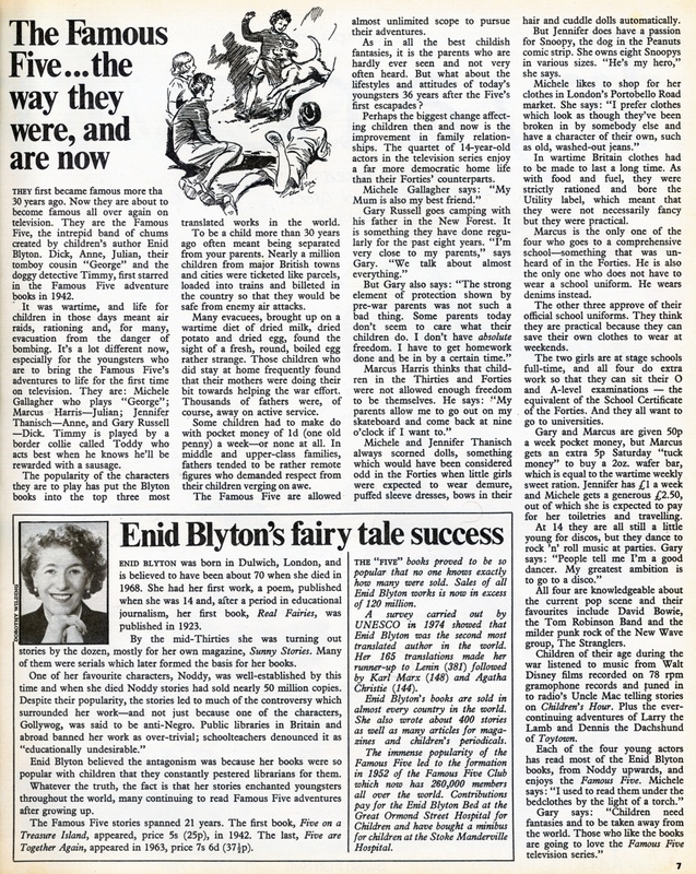 Übersetzung:Die Fünf Freunde wie sie waren und wie sie heute sind Vor mehr als 30 Jahren wurden sie zum ersten Mal berühmt. Und nun sind sie dabei, im Fernsehen wieder berühmt zu werden. Sie sind die Fünf Freunde, die unerschrockene Gruppe von Freunden, die von der Kinderbuchautorin Enid Blyton kreiert wurde. Dick, Anne, Julian, ihre jungenhafte Cousine George und ihr Hundedetektiv Timmy spielten erstmals 1942 die Hauptrollen in den Fünf Freunde Abenteuerbüchern. Es herrschte Krieg und das Leben der Kinder damals war geprägt von Bombenangriffen, Rationierung und für viele auch Evakuierung vor der Gefahr von Bombardierung. Heute ist vieles anders, vor allem für die Kinder, die die Abenteuer der Fünf Freunde zum ersten Mal im Fernsehen zum Leben erwecken werden. Das sind: Michele Gallagher, die George spielt; Marcus Harris Julian; Jennifer Thanisch Anne und Gary Russell Dick. Timmy wird von einem Border Collie gespielt, der am besten arbeitet, wenn er weiss, dass er mit einem Würstchen belohnt wird. Die Popularität der Charaktere, die sie spielen werden, machte die Blyton-Bücher zu den drei meistübersetzten Werken der Welt. Vor mehr als 30 Jahren ein Kind zu sein, hiess oft, von deinen Eltern getrennt zu werden. Fast eine Million Kinder aus grösseren britischen Dörfern und Städten wurden wie Pakete mit einer Etikette versehen, in Züge verladen und im Land untergebracht, damit sie vor feindlichen Luftangriffen geschützt waren. Viele der Evakuierten wuchsen mit einer Kriegsdiät in Form von Milchpulver, getrockneten Kartoffeln und getrockneten Eiern auf und fanden den Anblick eines frischen, runden, gekochten Eis eher seltsam. Jene Kinder, die zuhause blieben, erlebten regelmässig, wie ihre Mütter ihren Beitrag zu den Kriegsanstrengungen leisteten. Tausende Väter waren natürlich weg von zuhause im Aktivdienst. Einige Kinder mussten mit 1 pence (einem alten Penny) Taschengeld pro Woche oder gar nichts - auskommen. In Familien der Mittelklasse und der Oberschicht tendierten die Väter dazu, sehr distanziert zu sein und verlangten Respekt von den Kindern und flössten ihnen Furcht ein. Die Fünf Freunde haben fast absoluten Freiraum, um ihren Abenteuern nachzugehen. Wie in den Träumen aller Kinder, sieht und hört man von den Eltern kaum etwas. Aber was ist mit dem Lebensstil und der Einstellung der heutigen Kinder, 36 Jahre nach dem ersten Abenteuer der Fünf? Vielleicht die grösste Veränderung, die das Leben der Kinder betrifft, ist die Verbesserung der Beziehungen innerhalb der Familie. Das Quartett der 14-jährigen Schauspieler in der Fernsehserie genießen ein weitaus demokratischeres Familienleben, als ihre Pendants in den Vierzigerjahren. Michele Gallagher sagt: Meine Mutter ist auch meine beste Freundin. Gary Russell geht mit seinem Vater im New Forest zelten. Das ist etwas, was sie seit acht Jahren regelmässig tun. Ich stehe meinen Eltern sehr nahe, sagt Gary. Wir sprechen fast über alles. Aber Gary sagt auch: Diese starke Schutzfunktion, die Vorkriegseltern übernahmen, war eigentlich keine schlechte Sache. Einige Eltern scheint es heute nicht mehr zu kümmern, was ihre Kinder tun. Ich habe keine absolute Freiheit. Ich muss meine Hausaufgaben machen und zu einer bestimmten Zeit zuhause sein. Marcus Harris findet, dass Kinder in den 1930er und 1940er Jahren nicht genug Freiheit hatten, um sich selbst sein zu können. Er sagt: Meine Eltern erlauben mir, mit meinem Rollbrett raus zu gehen und um neun Uhr nach Hause zu kommen, wenn ich will. Michele und Jennifer haben Puppen nie gemocht, etwas das in den Vierzigerjahren als seltsam angesehen worden wäre, als von kleinen Mädchen erwartet wurde, dass sie züchtige Kleider mit Puffärmeln und Schleifen im Haar trugen und automatisch mit Puppen spielten. Aber Jennifer hat eine Passion für Snoopy, den Hund in den Peanuts Comics. Sie besitzt acht Snoopys in verschiedenen Grössen. Er ist mein Held, sagt sie. Michele mag es, ihre Kleider im Portobello Road Laden in London zu kaufen. Sie sagt: Ich bevorzuge Kleider, die aussehen, als hätte sie schon jemand getragen und die einen eigenen Charakter haben, wie zum Beispiel alte, verwaschene Jeans. Während des Krieges mussten Kleider in England so gemacht sein, dass sie lange hielten. Wie Nahrung und Treibstoff waren auch Kleider strikt rationiert und trugen das Nützlichkeitslabel, was hiess, dass sie nicht unbedingt modisch, dafür aber praktisch waren. Marcus ist der Einzige der Vier, der an eine Gesamtschule geht etwas das in den Vierzigerjahren völlig unbekannt war. Er ist auch der Einzige, der keine Schuluniform tragen muss. Er trägt stattdessen Jeanshosen. Die anderen Drei finden ihre offizielle Schuluniform gut. Sie finden sie praktisch, weil sie so ihre eigenen Kleider für die Wochenenden sparen können. Die beiden Mädchen gehen an eine Bühnenschule und alle Vier arbeiten noch mehr, damit sie ihre O- und A-Stufe-Prüfungen machen können was dem Schulzertifikat der Vierzigerjahre entspricht. Und alle wollen an Universitäten gehen. Gary und Marcus bekommen beide je 50p Taschengeld pro Woche, Marcus bekommt aber am Samstag noch 5p extra dazu, um sich einen 50g Waffelkeks kaufen zu können, was in Kriegszeiten ebenfalls einer Wochenration an Süssigkeiten entsprach. Jennifer bekommt £1 pro Woche und Michele grosszügige £2.50, womit sie sich aber auch ihre Toilettenartikel und Reisen finanzieren muss. Mit 14 sind sie alle noch etwas jung für Discos, aber sie tanzen zu Rock ´n´ Roll-Musik an Partys. Gary sagt: Die Leute sagen zu mir, dass ich ein guter Tänzer sei. Meine größte Ambition ist, in eine Disco zu gehen. Alle Vier wissen über die momentane Popszene gut Bescheid und zu ihren Favoriten gehören David Bowie, die Tom Robinson Band und der mildere Punk Rock der New Wave Gruppe, The Stranglers. Während des Krieges hörten Kinder ihres Alters Musik aus Walt Disney Filmen, aufgenommen auf 78 rpm Gramophonplatten, die eingeschaltet wurde, wenn U