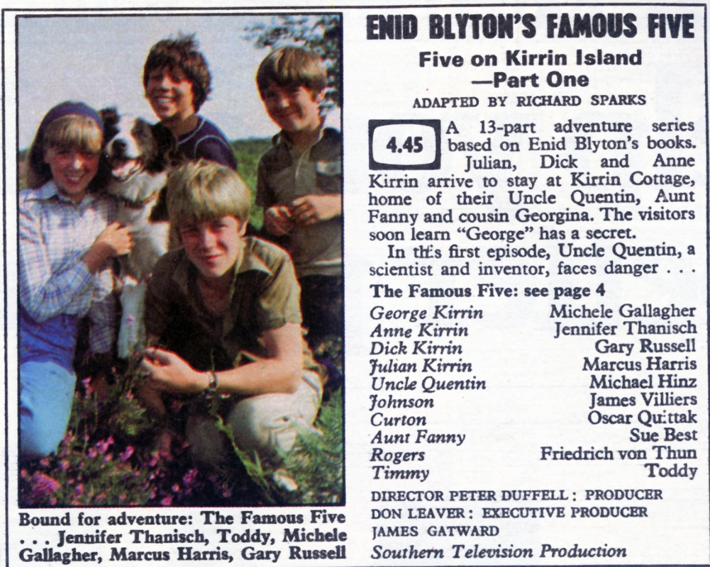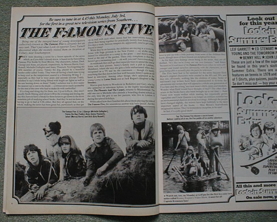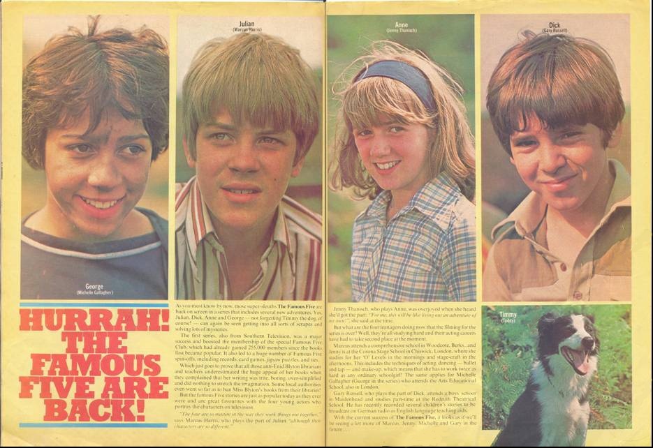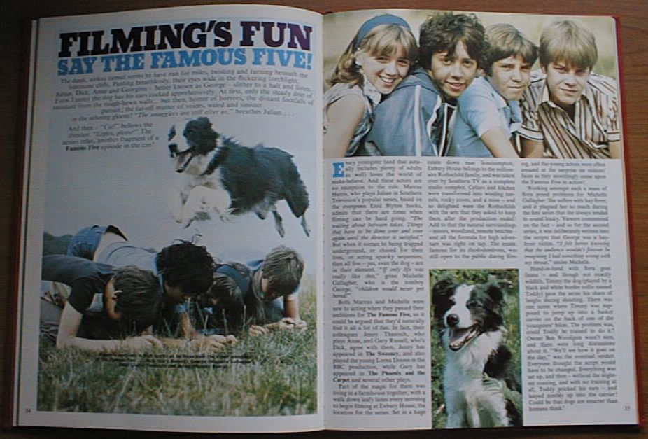 Übersetzung:TV Times Vol. 92, Nr. 27, 29. Juni 1978 Wieder zusammen die Fünf Freunde von Patsy Ledger/Fotos von Peter Bolton In den drei Jahrzehnten nachdem Enid Blyton die Fünf Freunde erfunden hat, wurde die Welt der Kinder auf den Kopf gestellt. Während des Krieges mussten die Kinder in England mit einem Penny Taschengeld pro Woche auskommen und trugen die Kleider der Brüder und Schwestern auf. Es gab Rationierung, um den Appetit zu zügeln und die Fantasie wurde durch die Childrens Hour und Walt Disney Musicals begrenzt. Heutige Kinder würden das nicht mehr dulden. Mit Taschengeld, das oft im Pfund-Bereich liegt, Rollbrettern und modischer Kleidung, Discos und David Bowie und erstaunlicher Freiheit, unterscheiden sie sich völlig von ihren Pendants der Kriegszeit. Hier und auf der folgenden Seite sprechen die Kinder, die die Fünf Freunde spielen, darüber, wie es ist, jung zu sein in den Vierziger- und in den Siebzigerjahren. Timmy: Der Hundedetektiv des Fünf Freunde Teams, gespielt von Border Collie Toddy: Mir wurde beigebracht, dass ein Hund für seinen Lebensunterhalt arbeiten muss. Michele Gallagher: Meine Mutter ist meine beste Freundin. Ich mag Puppen nicht besonders und meine Kleider müssen so aussehen, als hätten sie einen eigenen Charakter. Marcus Harris: Kinder sollten sich selbst sein können. Ich kann mit meinem Rollbrett rausgehen und um neun Uhr zuhause sein, wenn ich will. Jennifer Thanisch: Mein Held ist Snoopy. Ich finde, Schuluniformen sind okay. So kann ich meine Kleider für das Wochenende sparen. Ich wollte in meinem Gymnastikanzug fotografiert werden. Ich trage ihn während der Stepptanzstunden und er ist sehr bequem. Gary Russell: Ich stehe meinen Eltern sehr nahe. Vielen Leute scheint es heute egal zu sein, was ihre Kinder anstellen. Ich bin nicht absolut frei und muss zu einer bestimmten Zeit zuhause sein. | |