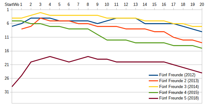 In der oberen Grafik sind die Kinobesucher aller fünf Fünf-Freunde-Kinofilme übereinander gelegt. Man sieht deutlich, daß der Film "Fünf Freunde 3" der mit Abstand erfolgreichste war.Auch bei der unteren Grafik sieht man, daß es "Fünf Freunde 3" sogar auf Rang zwei der meistgesehenen Filme in einer Woche geschafft hat.