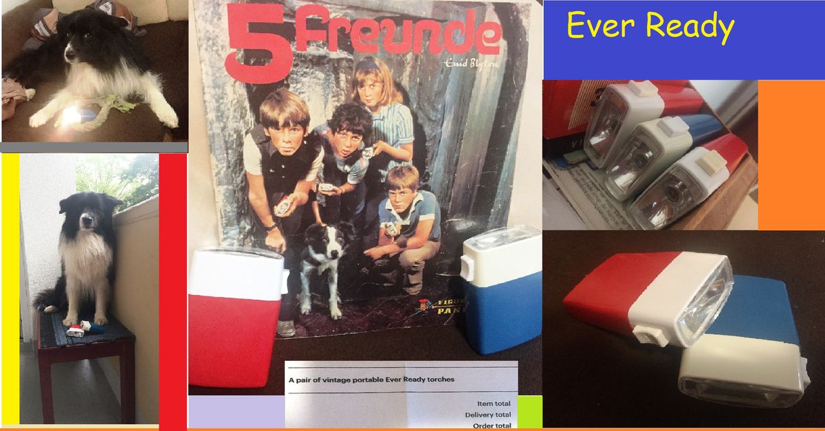 Ich habe eine kleine Collage angefertigt, so ein wenig im Stil der damaligen Zeit um die Taschenlampe ein wenig ins rechte Licht zu rücken, damit die "Fünf Freunde"-Fans auch das mal zu sehen bekommen.